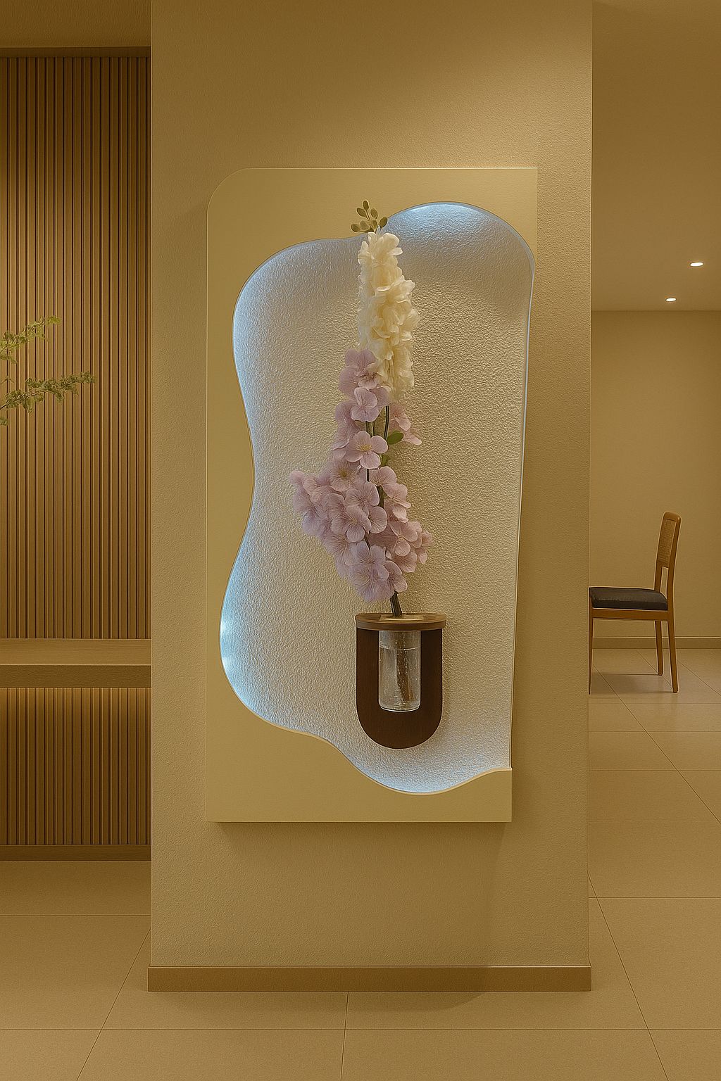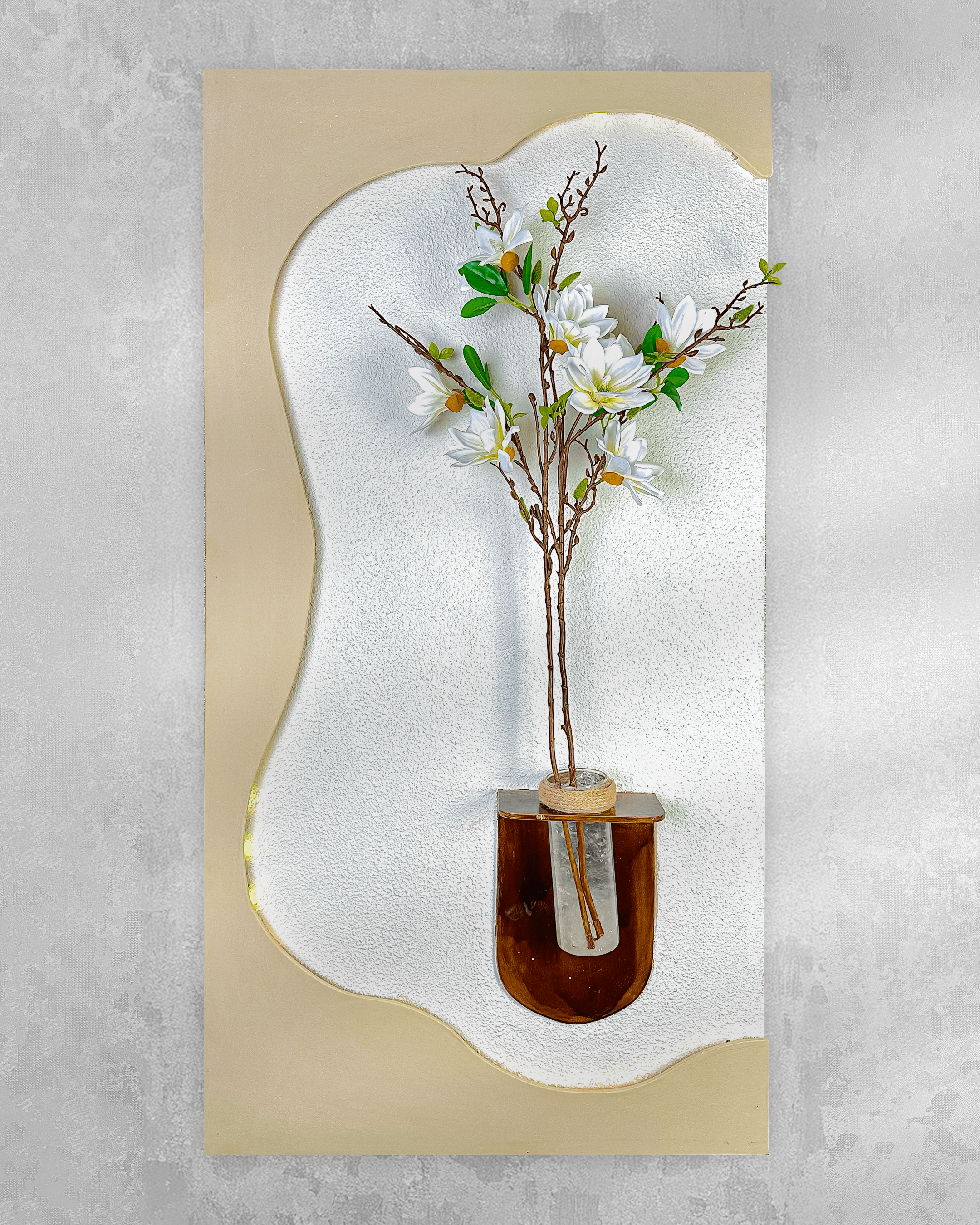 منحنيات ناعمة، أبعاد ثلاثية ملموسة، وزهرية زجاجية وسط لوحة فنية تدمج بين الفخامة والبساطة.