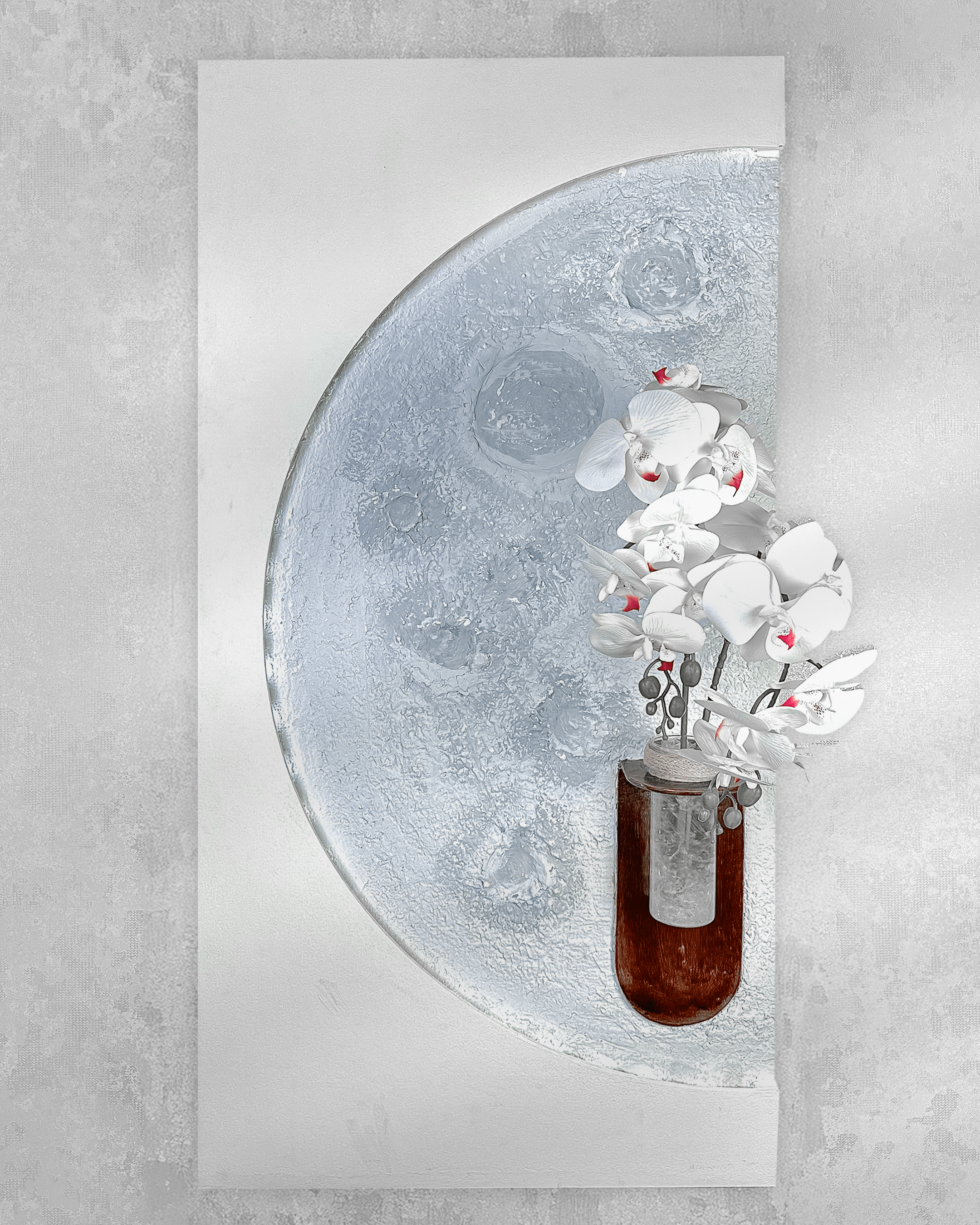منحنيات ناعمة، أبعاد ثلاثية ملموسة، وزهرية زجاجية وسط لوحة فنية تدمج بين الفخامة والبساطة.